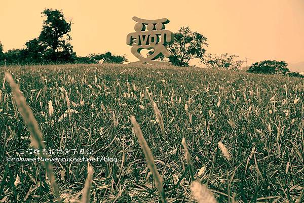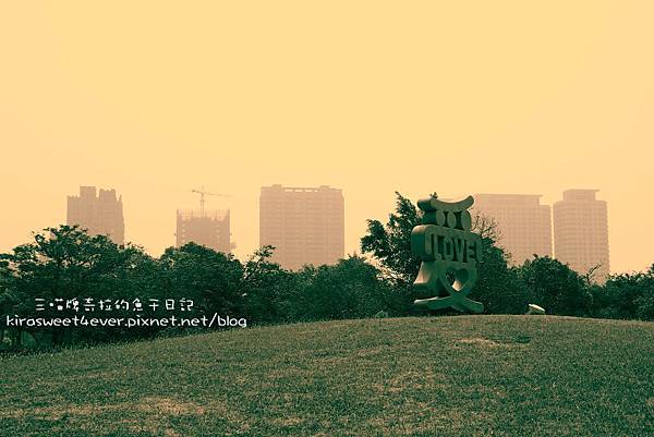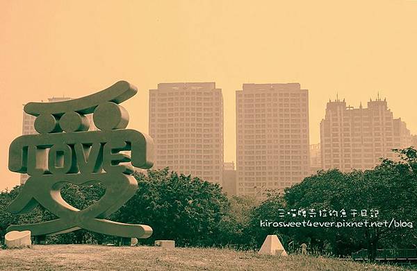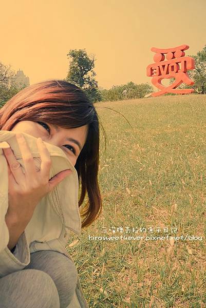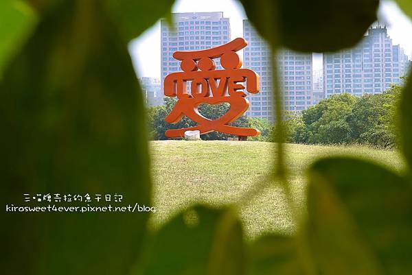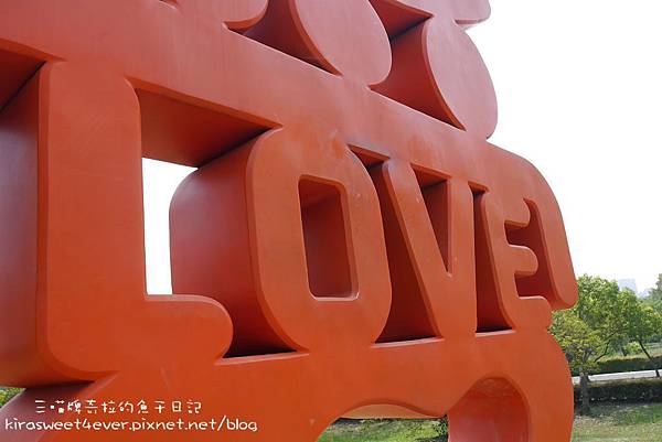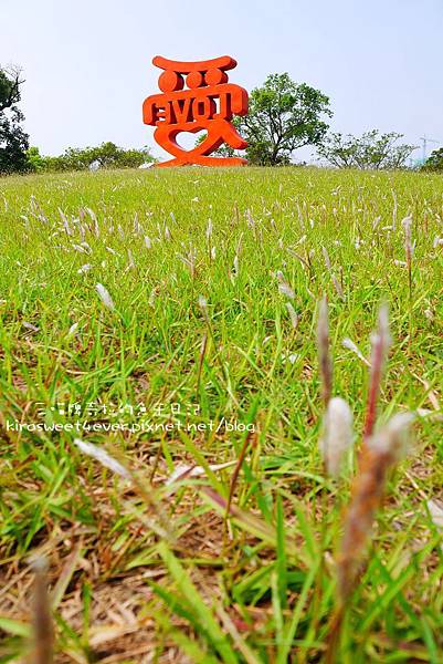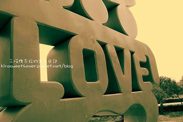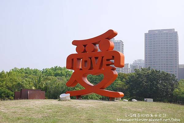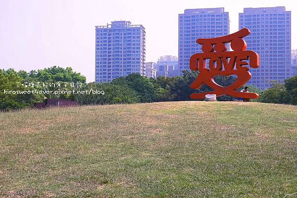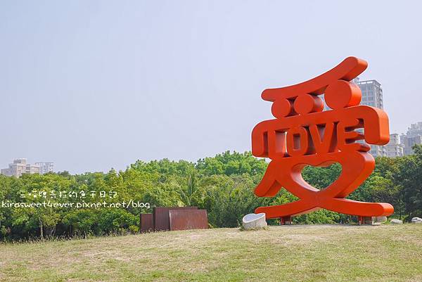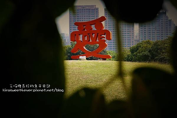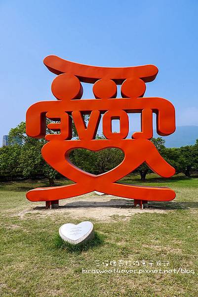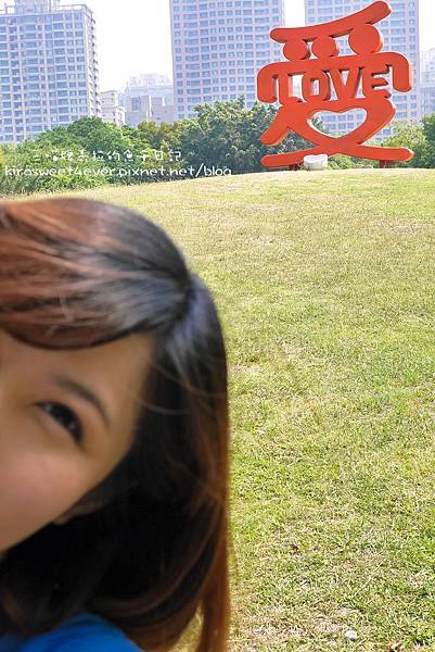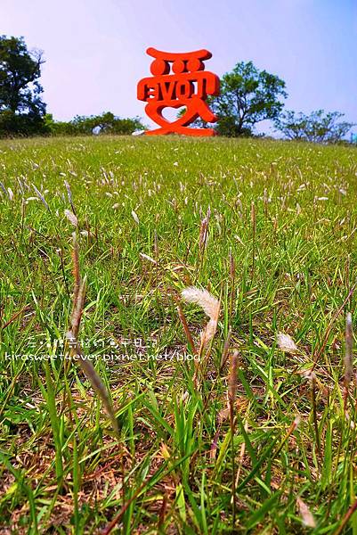 綠油油的草坡上, 佇立著這大紅愛字, 顯得這份愛好美, 好耀眼