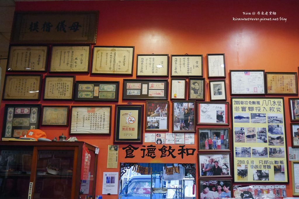從門口掛上愛心餐牌子,以及牆上莫拉克風災老實麵也有投入救災