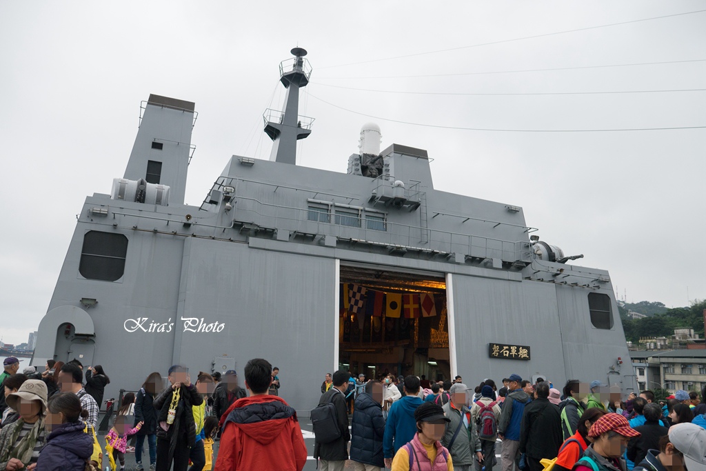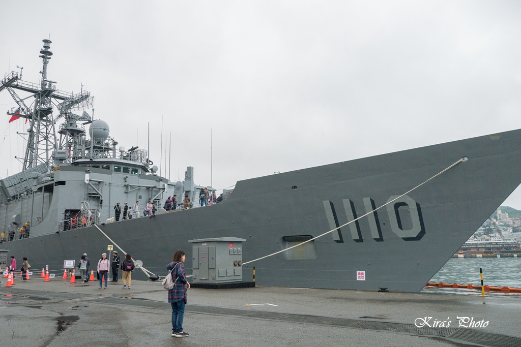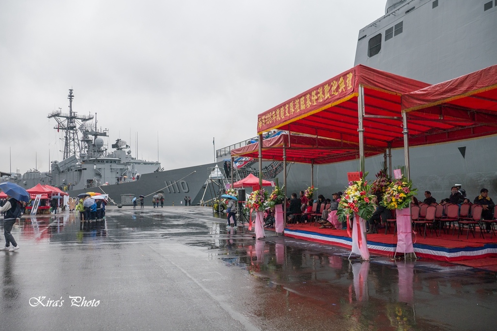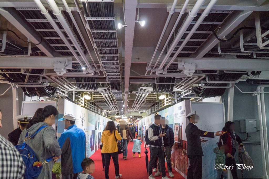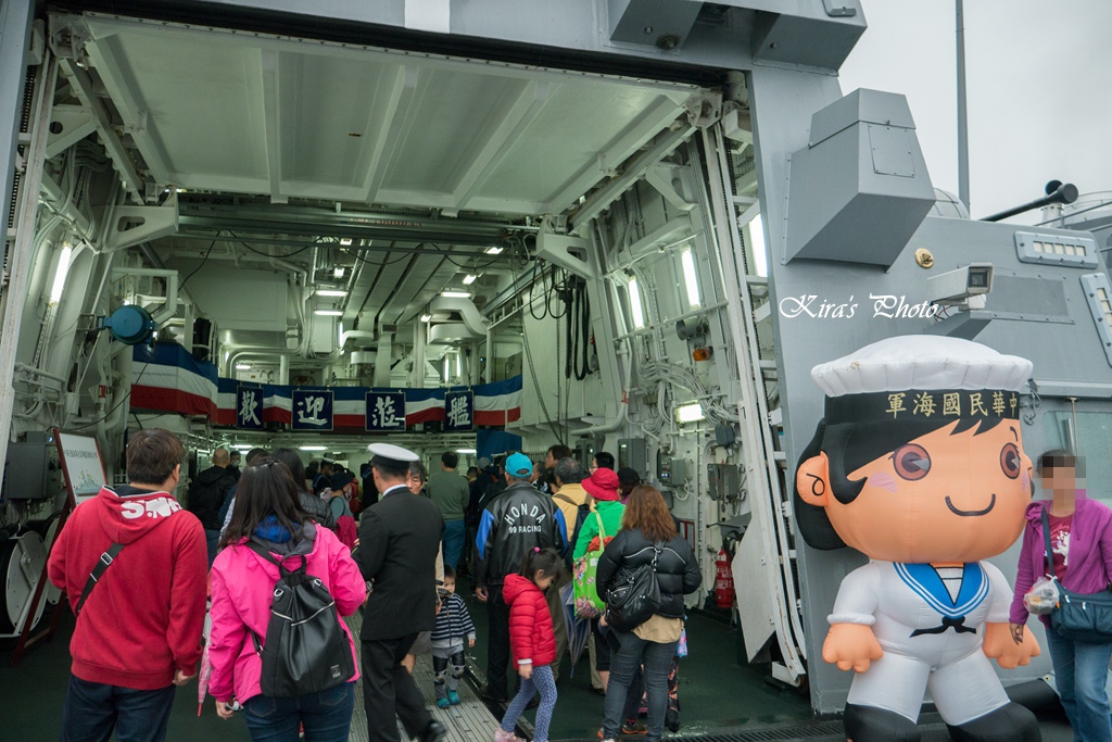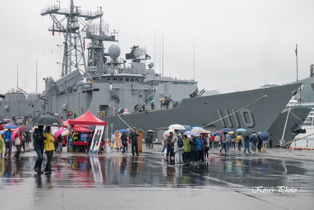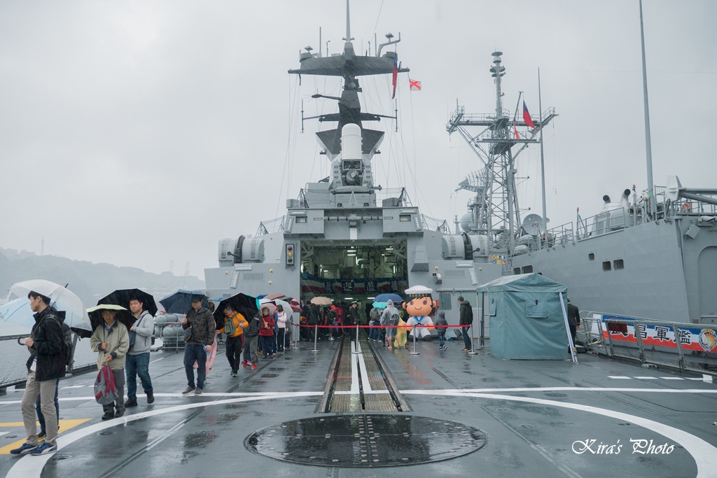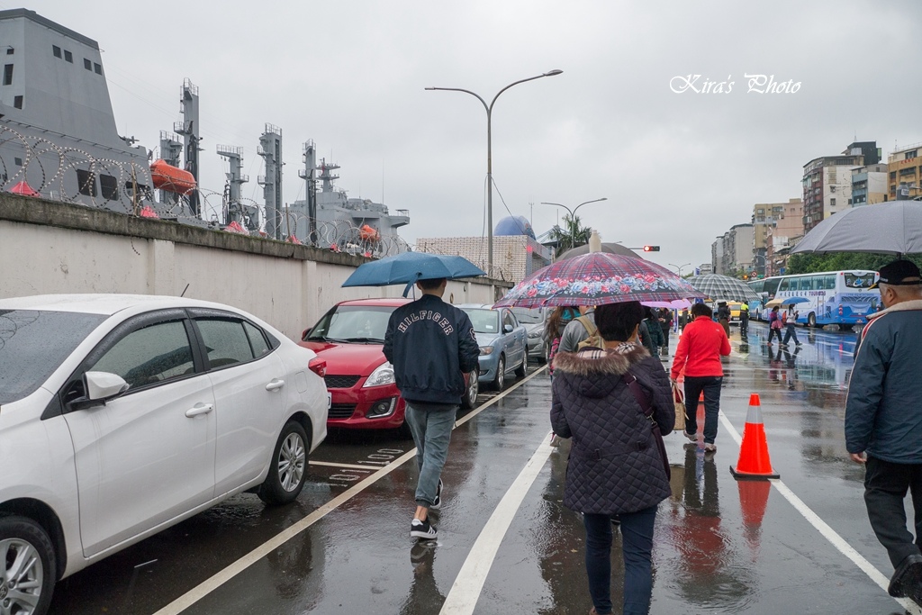 參觀日大雨滂沱,光是停車就停到步行約莫15分鐘距離以外的停車場,向目的地邁進的途中兩旁都有好多人和車,這樣的雨勢和人潮,其實當下也有點猶豫要不要放棄軍艦改奔廟口算了,好在人潮消化的還算快,沒有等太久,不過原本預定會有的表演好像就因雨取消了,也是有點可惜